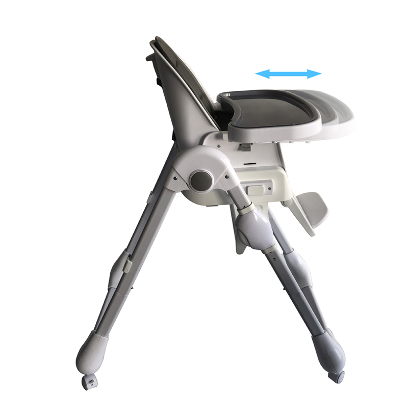 1.Double tray and easy to clean 2. Adjustable 3 positions of backrest 3.Adjustable 3 positions for tray and 4 positions for footrest 4. Adjustable 6 position height 6. it can match with baby car seat and sleeping basket 7. Free standing folded position with handy tray storage